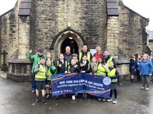 After almost 2 hours , the joyful pilgrims arrived at the Annunciation in New Mills, and joined all the pupils from St Mary’s school for a celebration mass, certificates and Jubilee badges were presented to all the young pilgrims by Fr Greg ….. a wonderful celebration of the Jubilee, and the two parish schools!